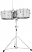 All LP Tito Puente Timbales, Thunder Timbs, and Timbalitos are sold complete with a chrome plated, heavy duty, steel Timbale Stand. The stand has a die cast, geared tilter that locks in tight for either straight or tilted playing. It is height adjustable, and also has an anti-rattle sleeve. It comes complete with an adjustable cowbell holder made from welded steel and features LP’s superior eye-bolt assembly. LP Timbale Shells are available in genuine stainless steel, solid brass, or bronze; each possessing its own distinct sound. The genuine stainless steel shells produce very bright and crisp, loud sounds; the solid brass shells produce warmer sounds; the bronze produces a superior and distinctive cutting cascara sound.